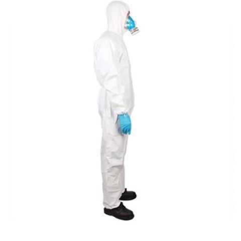 Quần áo chống hóa chất được làm bằng 2 lớp: Phim PE và vải không dệt, được dán bên ngoài bằng màng siêu nhỏ có độ bền cao – vật liệu vi mô siêu âm, thở Breath, không chứa silicone, chống tĩnh điện. Đường may chắc chắn, có bảo vệ bên ngoài. Dây vòng vào ngón tay giúp chặn sự chuyển động cổ tay áo khi đưa tay lên trên đầu.